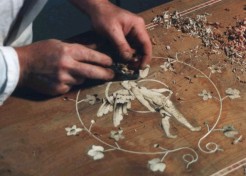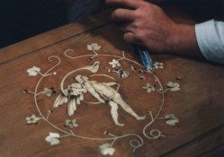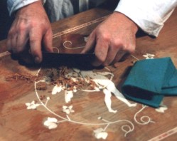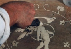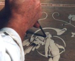 Come ultima operazione questo tipo di tarsia per essere completata dovrà essere incisa, con dei piccoli scarpelli e sgorbie per ottenere i particolari dei capelli e degli occhi, che non si possono ottenere con il seghetto a traforo. Per quanto concerne la finitura del mobile, nel capitolo dedicato ai materiali troveremo le informazioni necessarie per le operazioni della stuccatura e lucidatura del manufatto. |