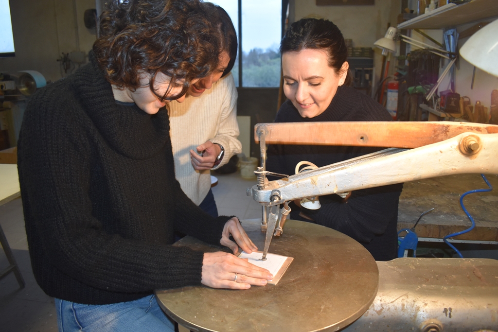 Visita esperienziale di tre giovani ragazze bolognesi nella mia bottega, tra teoria e pratica rompendo numerose seghette, ma sono state bravissime, per realizzare il loro primo intarsio. |